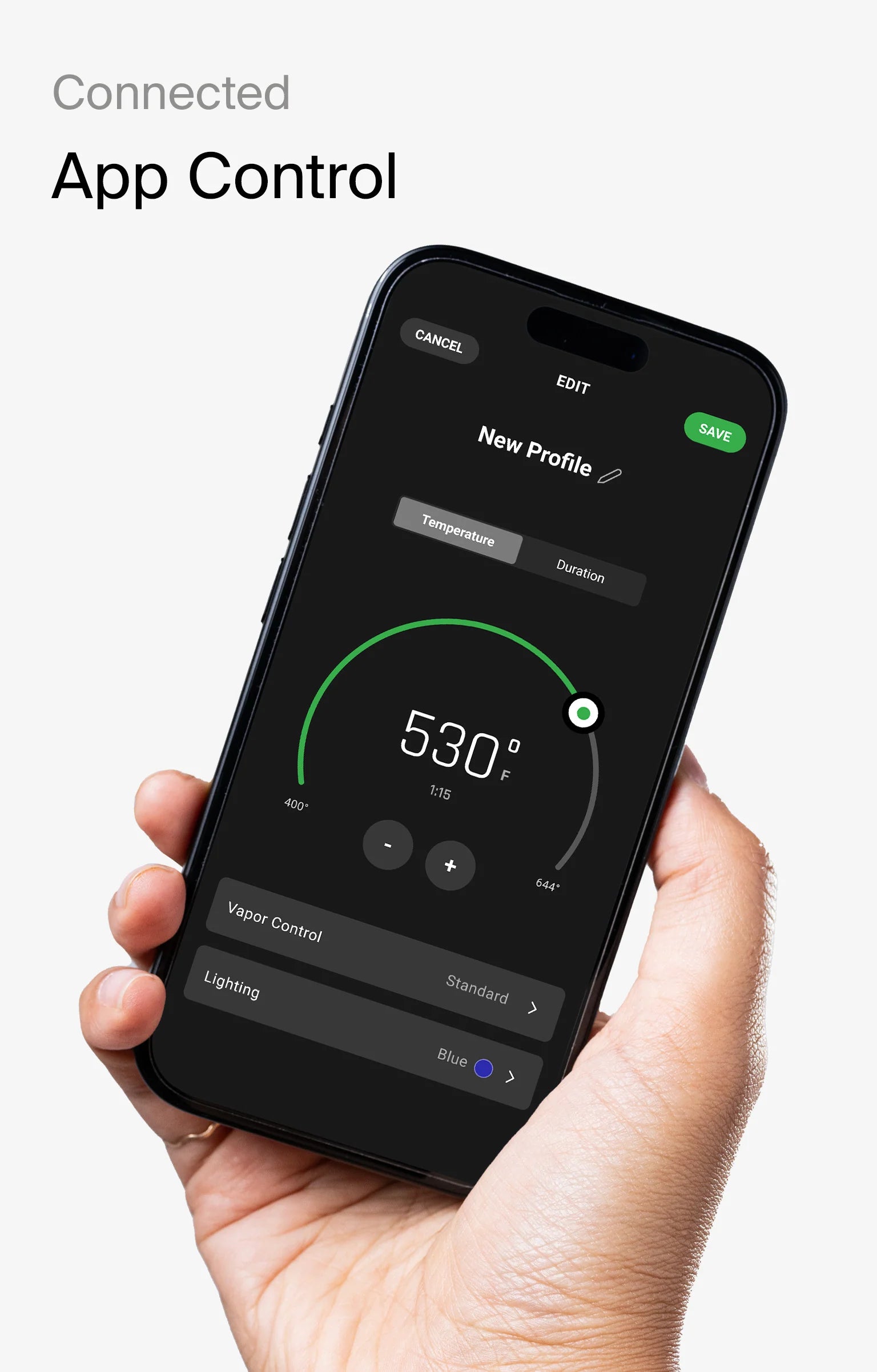 Mit der Puffco Connect App kannst du jede Session nach deinen Vorlieben gestalten: Temperatur und Heizdauer präzise einstellen, Dampfintensität regulieren und sogar die LED-Beleuchtung individuell anpassen.